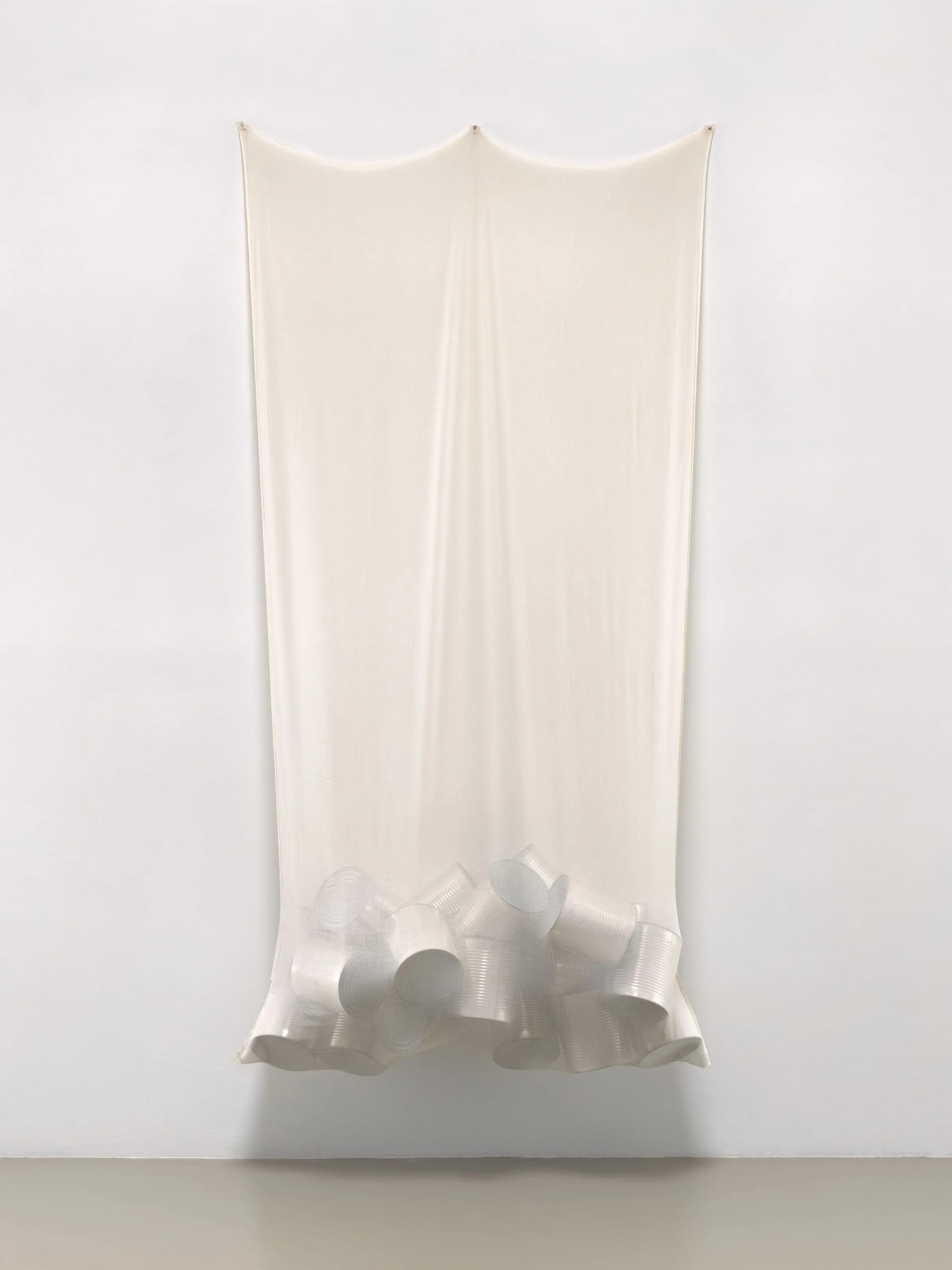 Coin, consisting of a fabric rectangle filled with empty tin cans, sags on the wall with a humorous, haunting, and inexplicably holy presence, not dissimilar to the Robert Gober tombstones. Any labels on the cans have been removed and all contents have been consumed. I imagine Coin in motion. It would clank wonderfully as an inanimate partner in a modern dance number.