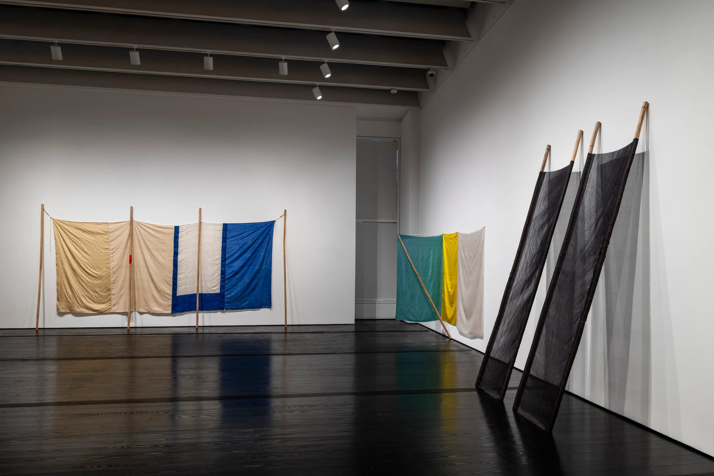The Jammers series brings the shadow-play into three dimensions and the fabric remains unprinted. Bamboo poles and string suspend the silks into distilled Renaissance-esque abstractions. Provisionally perched against the wall like impromptu sale banners in the making, shelters, or tools for motion, the works in this series have always intrigued me because they possess such changeable energy.